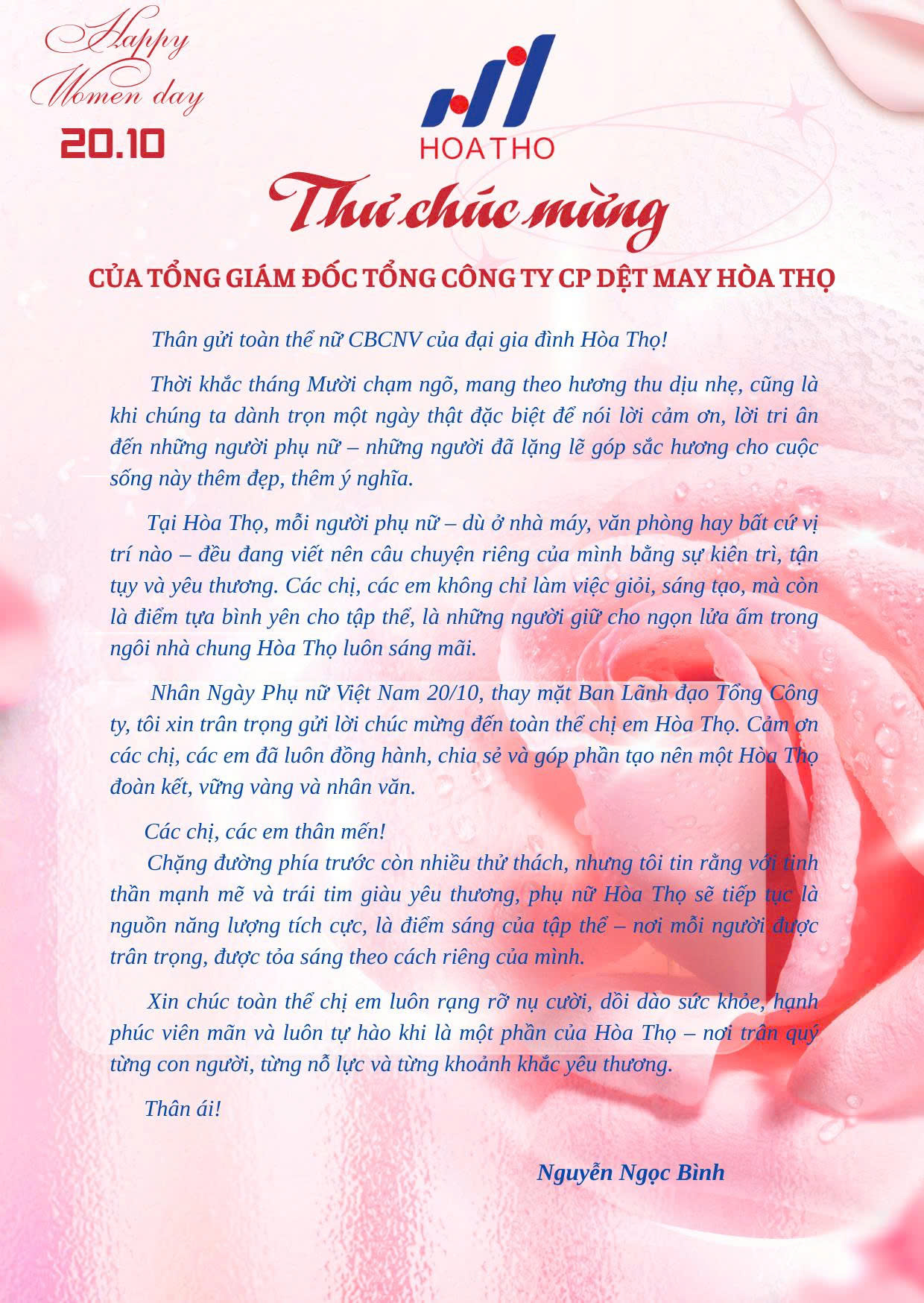 Nhân dịp kỷ niệm ngày Phụ nữ Việt Nam 20/10, xin gửi đến toàn thể nữ CBCNV Hoà Thọ thư chúc mừng của Tổng Giám đốc Nguyễn Ngọc Bình.