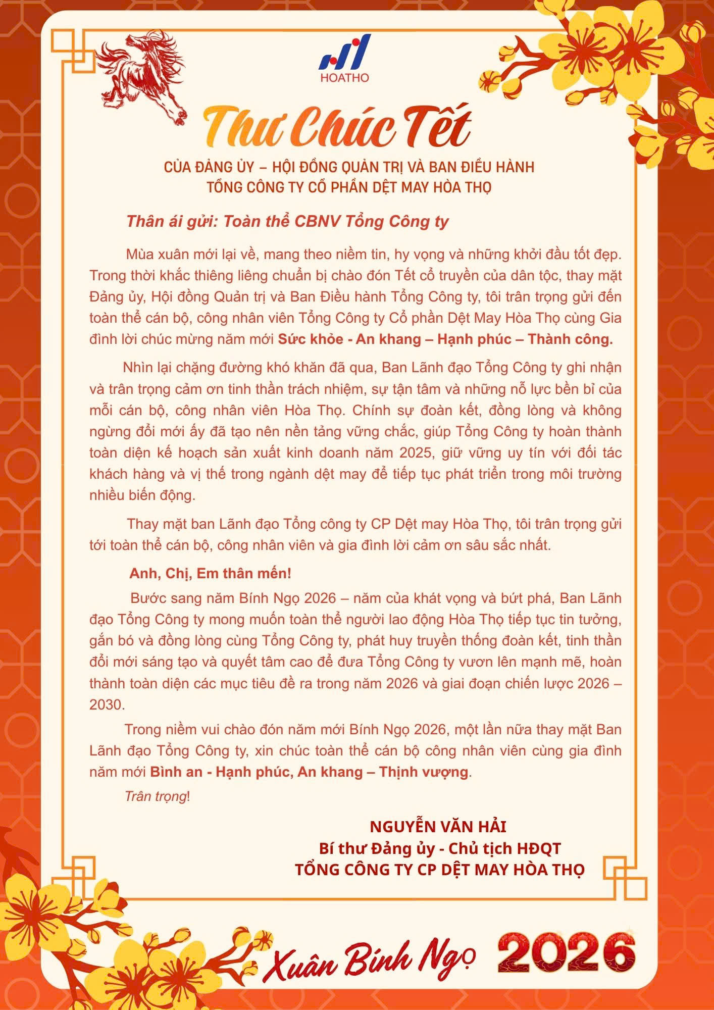 Nhân dịp Xuân Bính Ngọ 2026, Đảng ủy - Hội đồng quản trị và Ban điều hành Tổng Công ty CP Dệt May Hòa Thọ đã có thư chúc Tết gửi tới toàn thể CBCNV và người lao động đang công tác tại các đơn vị trong hệ thống của Hòa Thọ. Xin trân trọng giới thiệu toàn văn Thư chúc Tết tới toàn thể CBCNV và người lao động.